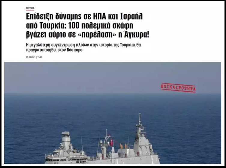 Cumhuriyetin 100. Yılı kapsamında Milli Savunma Bakanlığı, İstanbul Boğazı’nda 100 gemi ile geçit töreni düzenlemişti. “100’üncü Yılda 100 Gemi” adı verilen resmigeçide Türk donanmasından TCG Anadolu’nun rehberliğinde fırkateynler, Ada sınıfı korvetler, mayın avlama gemileri, amfibi gemiler, karakol gemileri, lojistik gemileri, hücumbotlar ve denizaltılar katılmıştı. Komşu Yunanistan basını bu resmigeçidi bir “güç gösterisi”, “gözdağı” ve hatta “açık tehdit” olarak nitelendirmiş ve bu geçidin kendilerine bir meydan okuma olduğunu yazmışlardı.