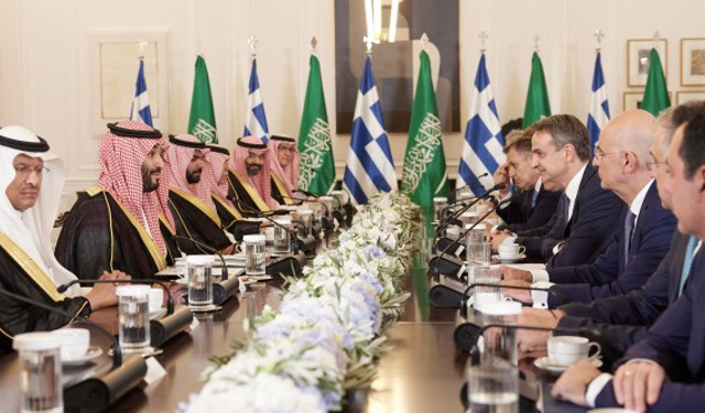 Yunanistan Başbakanı Kiryakos Miçotakis ile bin Selman’ın ikili görüşmesinin ardından iki ülke heyetleri bir araya geldi.